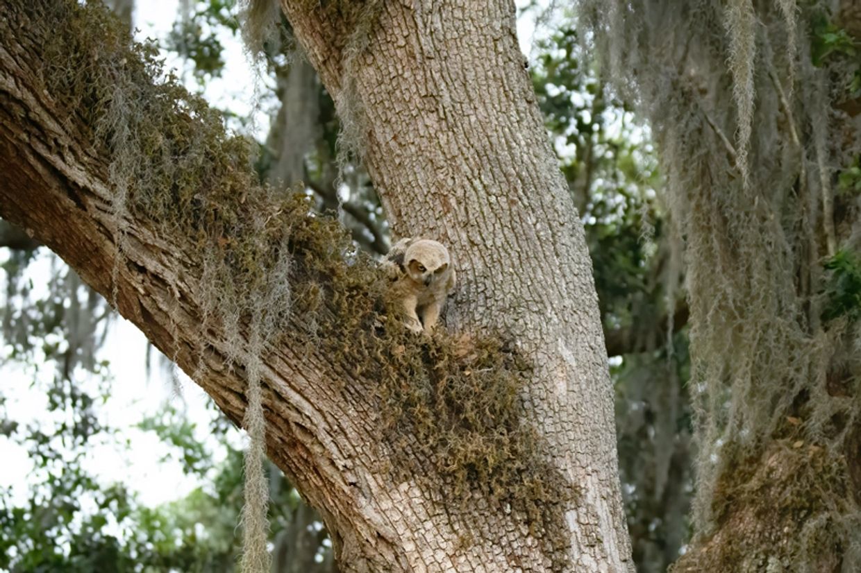 The fledglings are less active during the day now, usually beginning their activity just after the sun goes down, often moving from tree to tree soon after they wake up.
