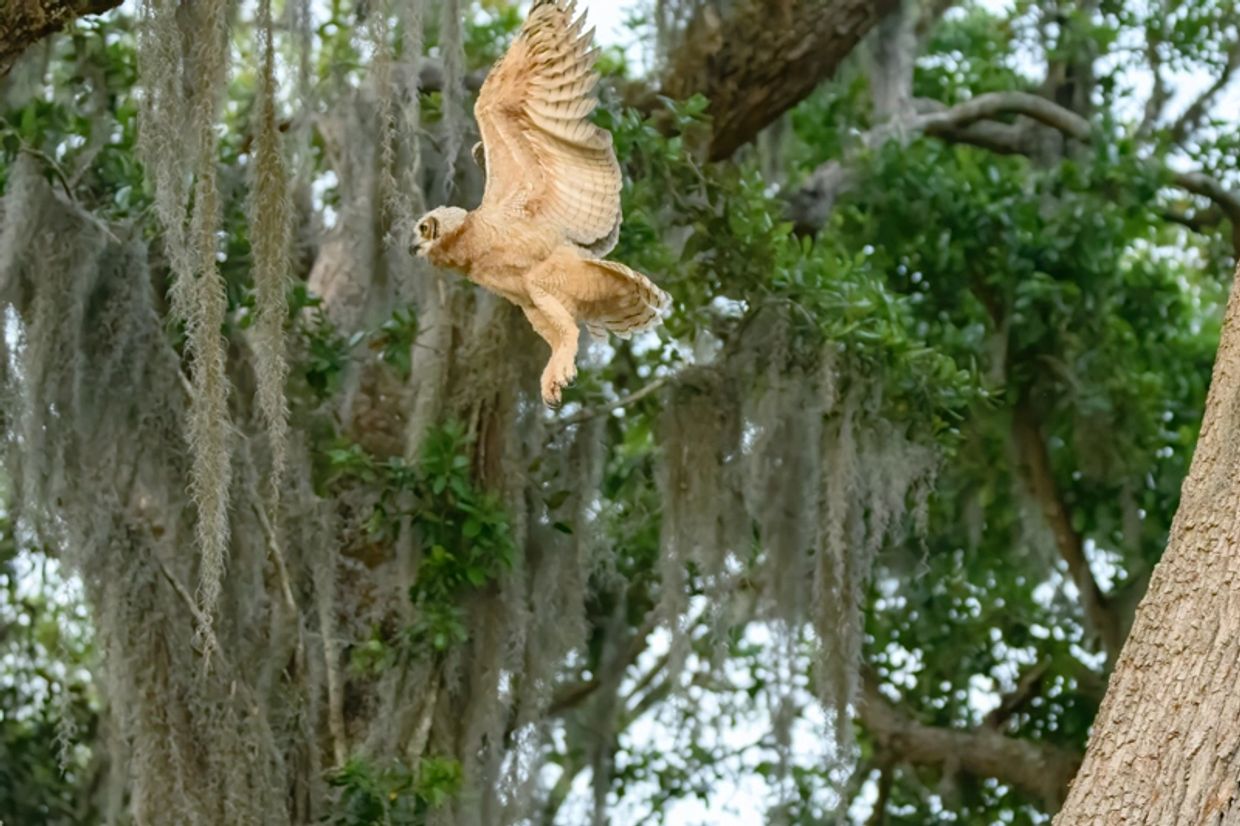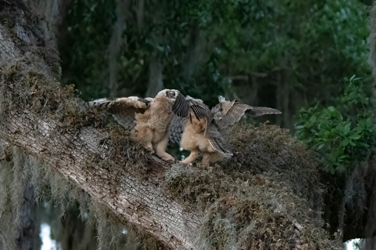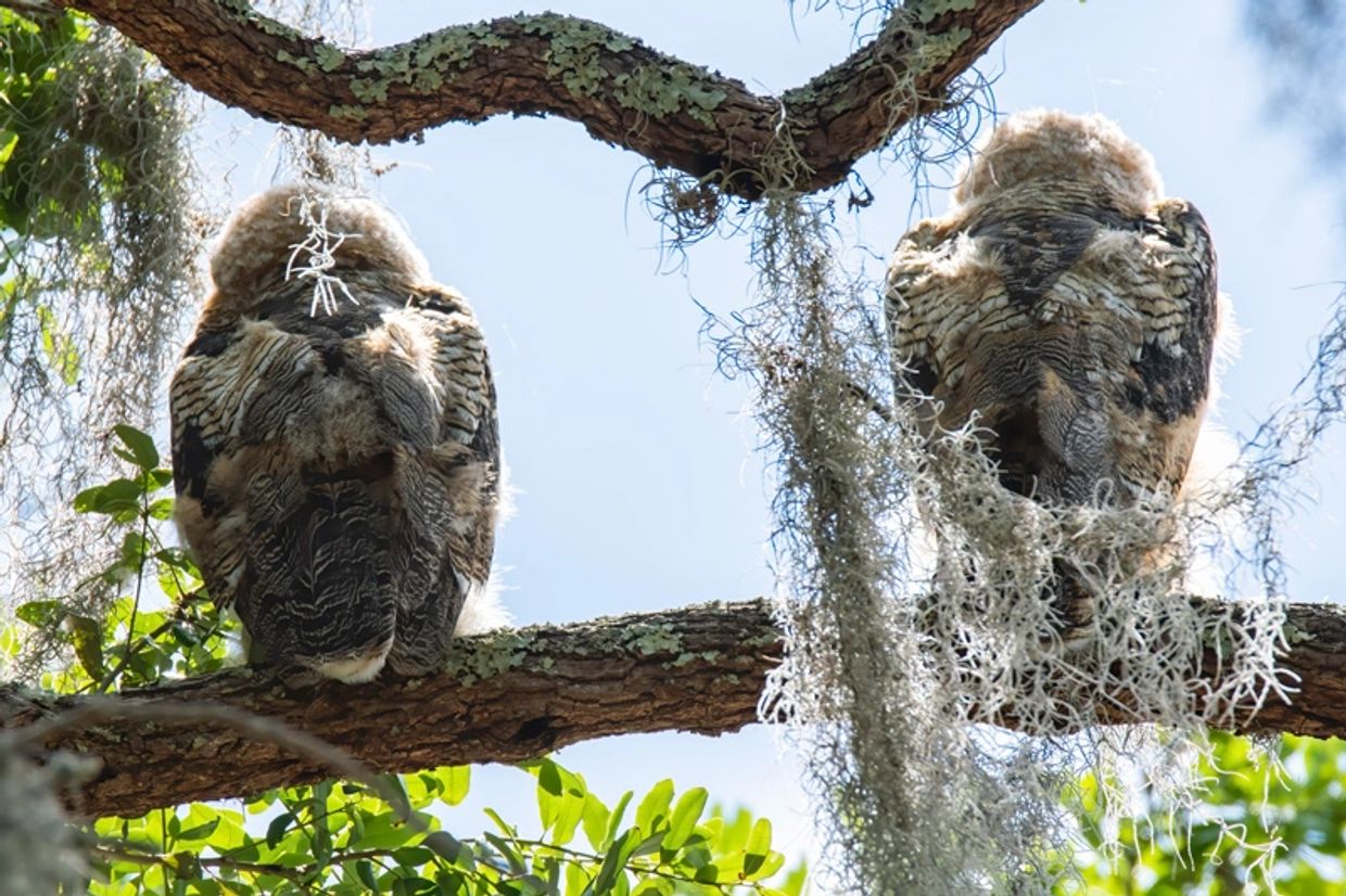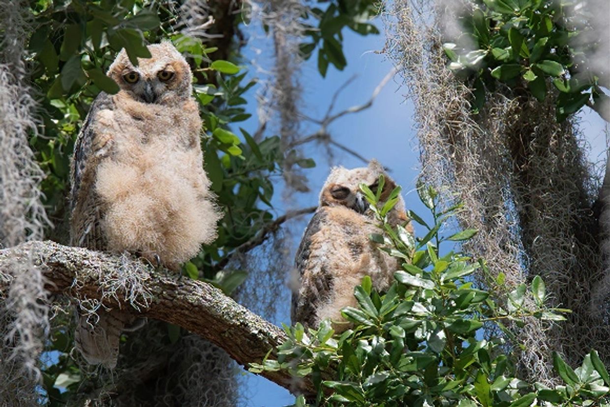 At 10 to 11 weeks, the fledgling’s flight skills have improved. It can maneuver into a denser canopy where the adults typically roost. The adult with ear tufts is on the right.